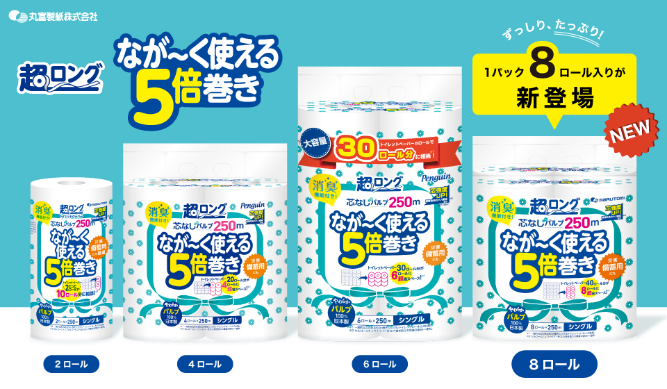 2022年発売の「超ロング5倍巻き6ロール」に加え、新たに「超ロング5倍巻き8ロール」を発売。